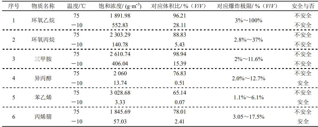 如表1所示,當真空泵出口尾氣溫度為75℃時,每種有機物質(zhì)的飽和濃度理論上非常高。如果廢氣稀釋率不足,很容易引起安全事故。單套PL真空泵的環(huán)氧乙烷泄漏量約為120m3/h,三個真空泵的總流量為360 m3/h。事故發(fā)生時焚燒爐的實際處理風量也不超過5000m3/h,2.4%的平均濃度在相應(yīng)的爆炸范圍內(nèi)。可見廢氣排放真空泵出口溫度過高,有機材料沸點低,導致有機廢氣濃度高。與此同時,相應(yīng)的稀釋倍數(shù)不夠,再加上環(huán)氧丙烷和環(huán)丙烷,氧乙烷化學性質(zhì),最終達到有機成分的相應(yīng)爆炸極限,造成爆炸事故。